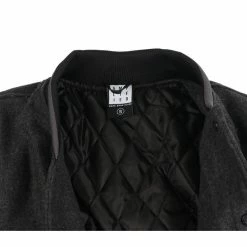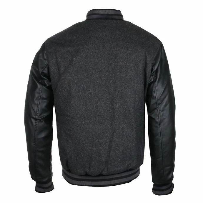 Color: dark grey, black sleeves and lining. Features: Two side open pockets Press stud fasteningWithout a hoodThin lining and thermal insulation Embroidery at the front Elastic cuffs The outer sleeve parts are made of synthetic leather (PU) Composition: 20% wool, 70% polyester, 10% acrylic.