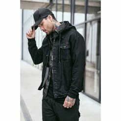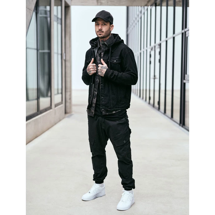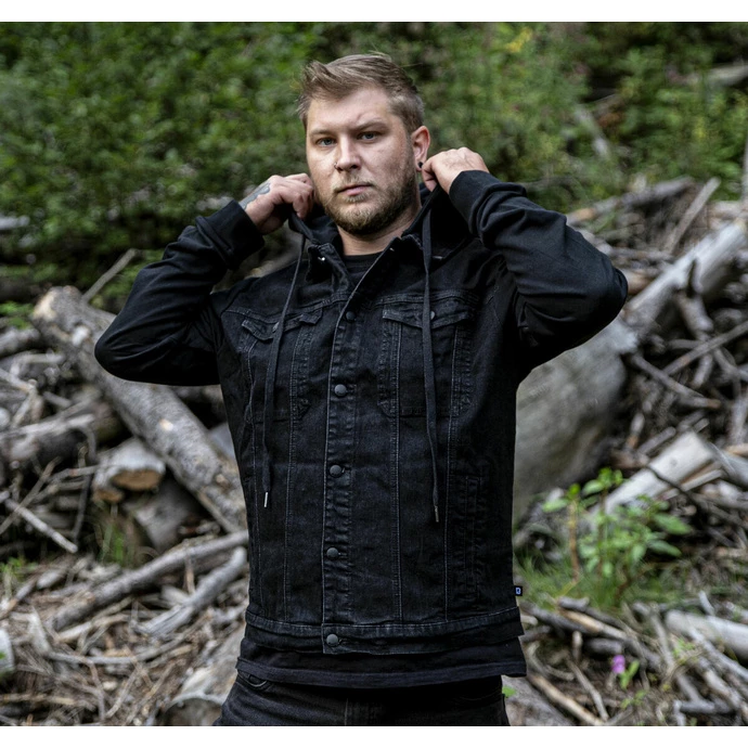 Stylish jacket by BRANDIT. Without lining and insulation. Features: without lining detachable hood the material is slightly elastic the fastening is solved by using buttons two side pockets two pockets on the chest covered with button-down flaps Composition: 75% cotton, 23% polyester, 2% elastene. Color: black with highlights Approx. dimensions in centimeters cca: (GIRTH is 2x width) Â