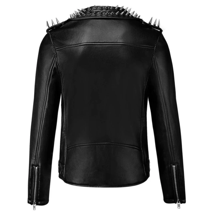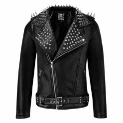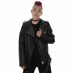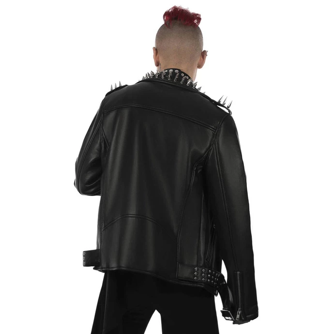Stylish jacket (metal jacket), by KILLSTAR decorated with lots of metal thorns – 100% vegan. Great and must-buy piece! This jacket is known as the “metal jacket”, is made of synthetic leather, you can wear it in every season (long life and durability). The lining is made of comfortable polyester. Zippers, buttons, thornes and other accessories are silver, they are made of metal. The jacket has two pockets with a zip fastening. Inside you will find a pocket with a zip fastening. The jacket also has a belt with a metal buckle. Metal zippers on the cuffs. Composition: 45% PU (synthetic leather) 55% polyester, metal accessories in silver color – 100% vegan. Approx. dimensions in centimeters cca: (GIRTH is 2x width)