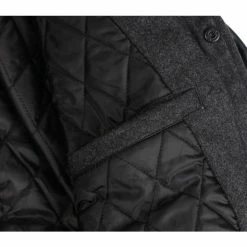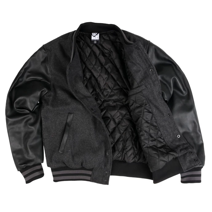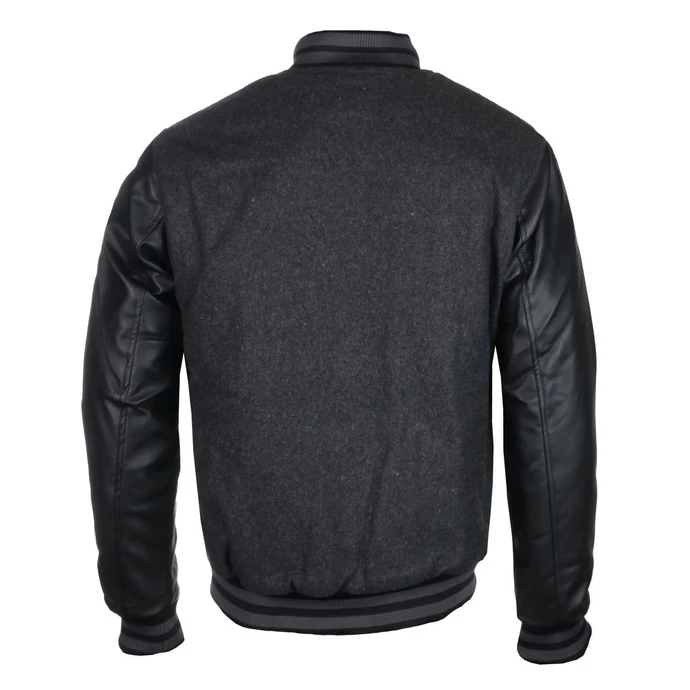 Stylish men’s jacket with light insulation. Ideal choice for spring / autumn, thanks to the light insulation the jacket can handle even colder weather. Features: Two side open pockets Press stud fasteningAdjustable hoodThin lining and insulationEmbroidery on the front Elastic cuffs The outer part of the sleeves is made of synthetic leather (PU) Composition: 20% wool, 70% polyester, 10% acrylic. Color: dark grey, black sleeves and lining. Approx. dimensions in centimeters (CIRC. is 2x width)