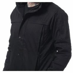Stylish men’s cloth jacket with fleece lining, by Vixxsin. Features:Zip fastening covered with a press stud flap Spacious hood with an inner synthetic fur The hood is attached by press studs, therefore can be easily removed Plenty closable pockets on the front Elastic cuffs and bottom hem Color: black. Composition: upper material – 100% cotton, lining – 100% polyester. Approx. dimensions in centimeters (CIRC. is 2x width)