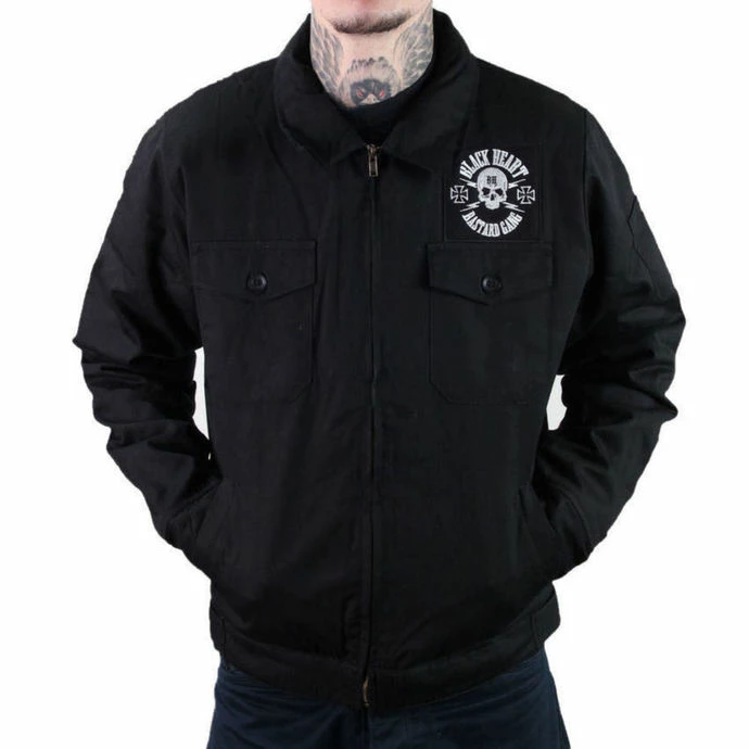 Men’s cloth spring / autumn jacket with thermal insulation, can be worn in cold weather or even in winter Brand BLACK HEART Material: upper material – 100% cotton, lining – polyester Equipment: Two side open pockets Two chest pockets covered with a button collar The bottom hem and sleeve ends can be pulled down with the buttons Zip fastening Embroidery at the front side Back print Color: black. The first photo shows the back of the jacket Approx. dimensions in cm (CIRC. is 2x width)
