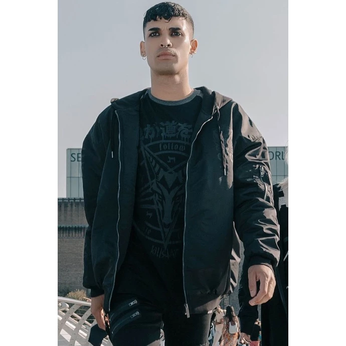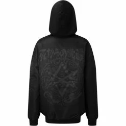 Unisex (men’s/women’s) jacket by KILLSTAR. BOMBER jacket cut. Thanks to the insulation, the jacket can be worn even in a cold weather. Features: the jacket has a fastening with a high-quality metal zipper two side pockets one pocket with a zipper on the left sleeve the ends of the sleeves and the bottom hem is finished with an elastic collar inner lining with an insulation cloth hood High quality print. Composition: upper material – 100% nylon, lining – 100% polyester, hood – 100% cotton. Color: black. Please note that the dimensions stated in the table below are only approximate and that the actual sizes between different products and styles may vary. Approx. dimensions in centimeters (CIRC. is 2x width)